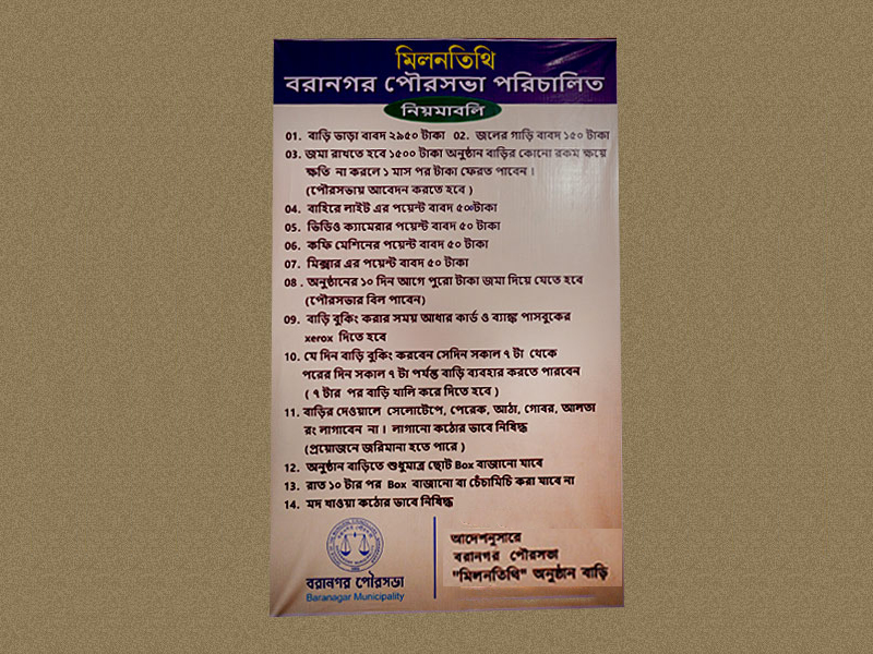 Baranagar Municipality has Community Hall services. These are available at a very low and affordable price for benefit of Common People and useful for Citizens of a vast surroundings.
